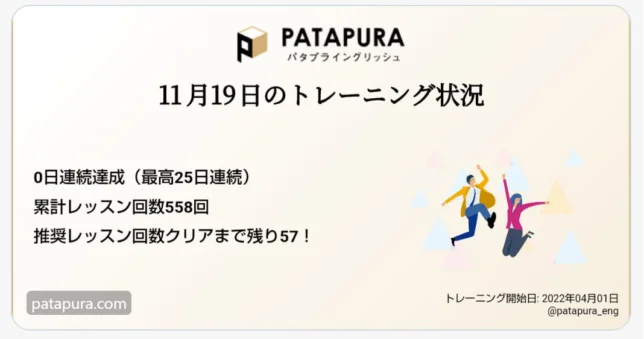パタプライングリッシュの全558レッスン(62レッスン×9回)が終わりました。 パタプライングリッシュとは パタプライングリッシュは、ビジネス英語のスピーキング…